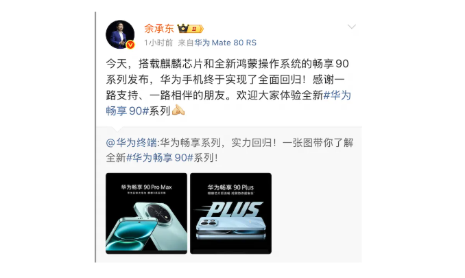 自Mate 60 先锋计划以来,华为率先实现了中高端机的回归,随着如今畅享90系列上线,华为手机终于实现了全面回归。